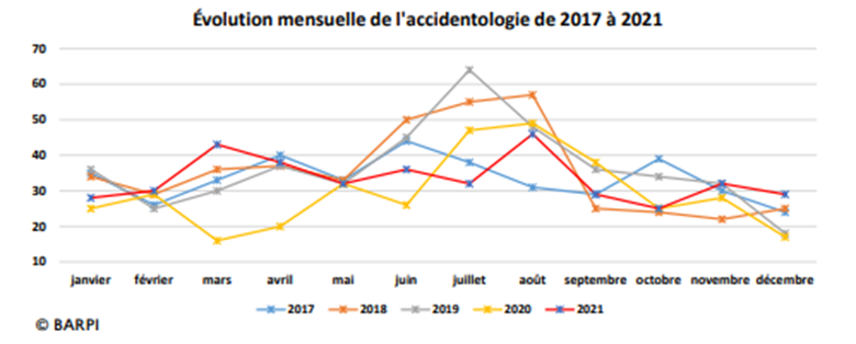 On peut également remarquer qu’en 2021, un pic des accidents est visible au mois d’août et plus généralement pendant la période estivale. De quoi faire preuve de vigilance pour l’été à venir.