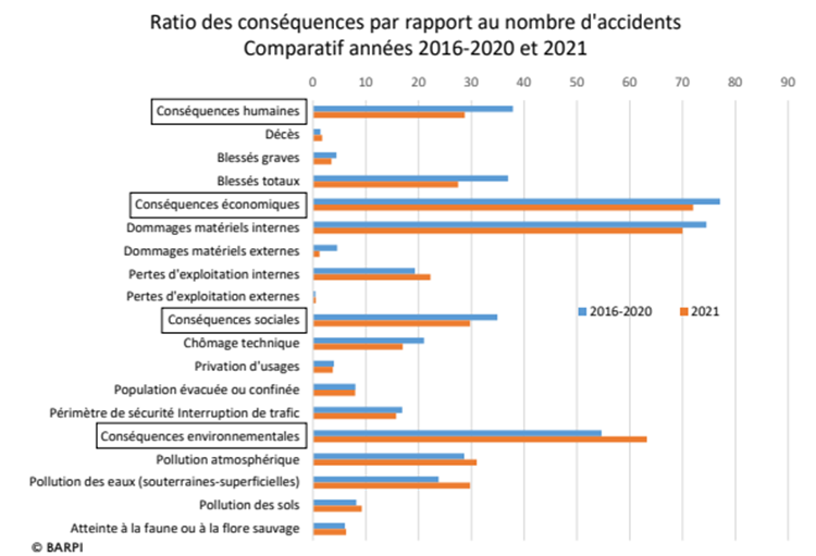 Globalement, le rapport révèle qu’en 2021 les conséquences économiques (dommages matériels internes, pertes d’exploitation, etc.) ainsi que les conséquences environnementales (pollution atmosphérique, pollution des eaux, etc.) représentaient une part importante par rapport au nombre d’accidents chez les industries.
