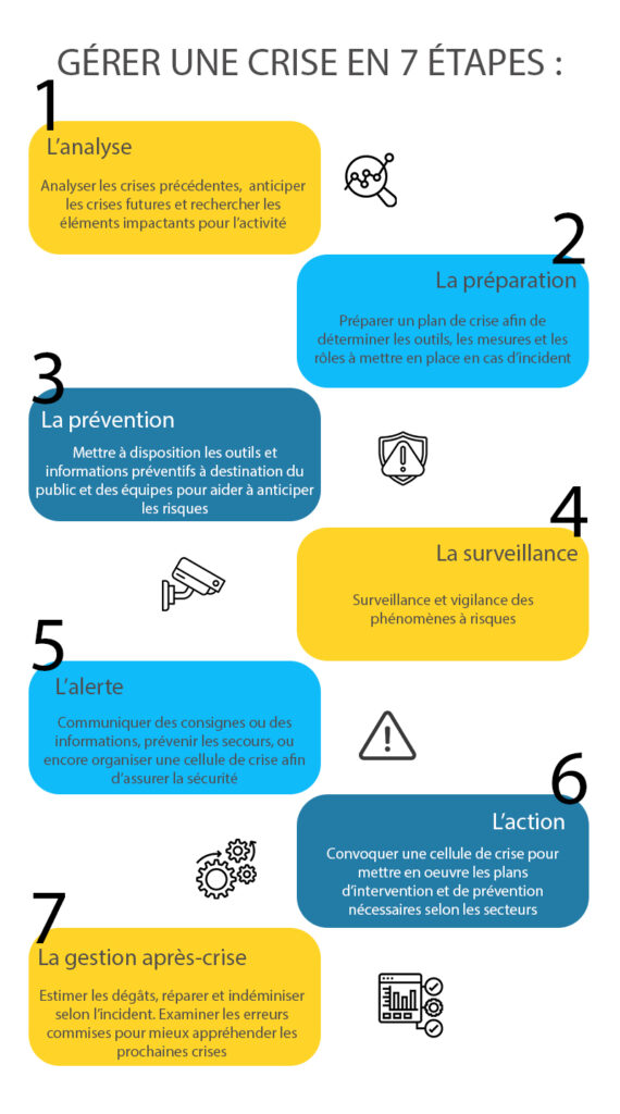 Faire face aux potentiels risques, c’est se préparer en amont grâce à l’analyse des crises passées, à l’anticipation des crises à venir, et à la recherche des phénomènes pouvant avoir un impact sur l’activité. Le but étant de bien évaluer les conséquences et de mettre en place des mesures préventives appropriées qui tiennent compte des paramètres définis.
