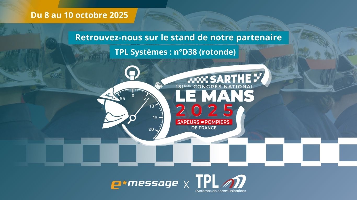Du 8 au 10 octobre 2025, e*Message, expert de l’alerte et des communications critiques, participera au Congrès National des Sapeurs-Pompiers de France (CNSPF) qui se tiendra au Centre des Expositions du Mans.